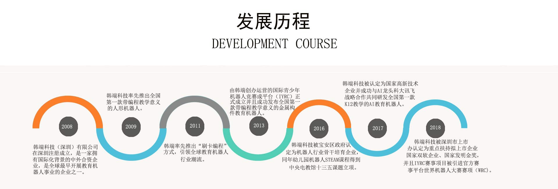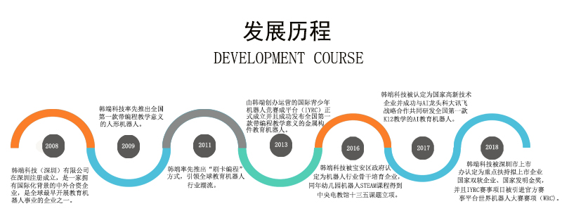 韓端科技(品牌:韓端、MY ROBOT TIME),于2008年在深圳成立,公司根植智能教育硬件賽道已經14年之久,是深圳也是中國最早專注于這個細分領域的本土品牌之一。公司致力于向海內外用戶提供以智能教育機器人為教學載體,覆蓋全學齡段的智能教育硬件產品和課程體系,是中國領先的機器人和人工智能編程教育產品技術服務商,也是我國青少年科學素質教育行業的拓荒者之一。公司是教育部全國信息技術標準化技術委員會單位委員,中國教育技術協會人工智能專委會發起單位、北京大學學習科學實驗室深度合作單位、國際青少年機器人協會(聯合國NGO理事會觀察員)創始單位。