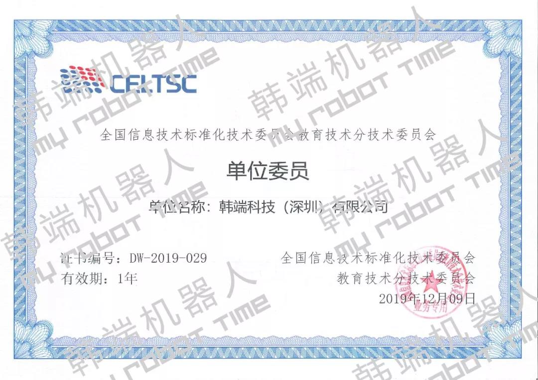 熱烈祝賀韓端機(jī)器人作為單位委員加入全國信息技術(shù)標(biāo)準(zhǔn)化技術(shù)委員會教育技術(shù)分技術(shù)委員會!