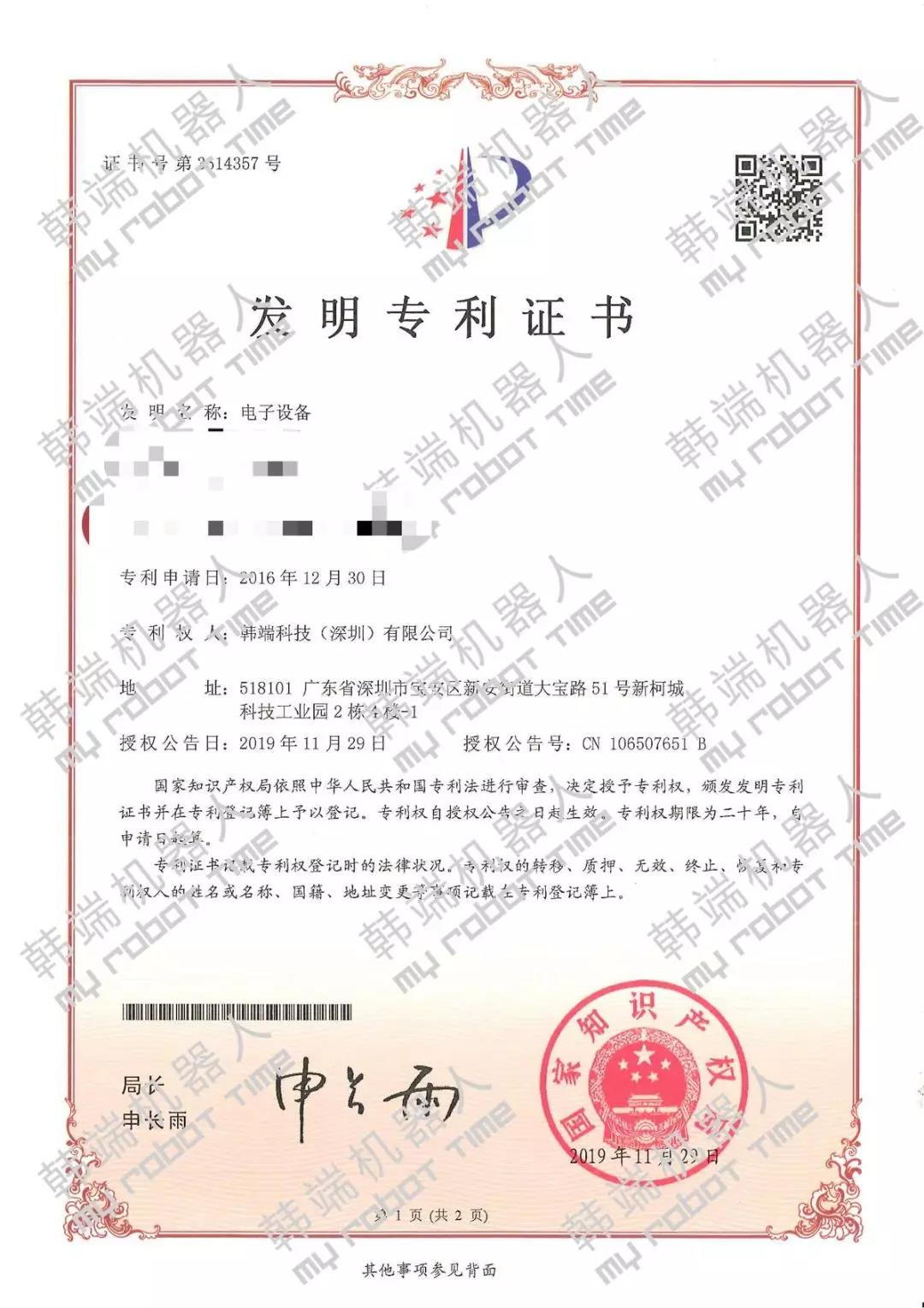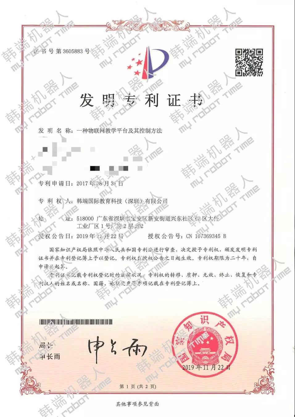 日前,韓端機器人項目名稱“電子設備”和“一種物聯網教學平臺及其控制方法”歷經嚴格的形式審查、專家評審、相關部門聯審等程序,成功下發發明專利證書,自此韓端專利數突破百個,攜手創新技術邁進2020年。