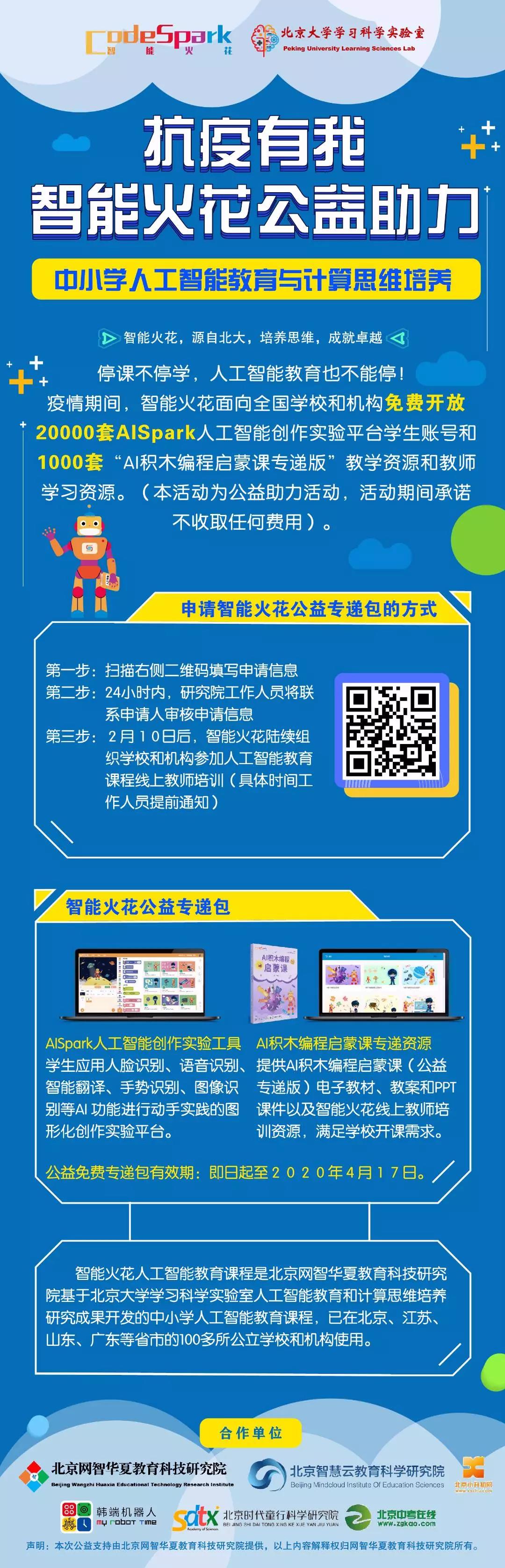 近期,新型冠狀病毒感染的肺炎疫情正處于關鍵時期,牽動著億萬群眾的心,國家政府多次發布停學、停課通知。為了讓孩子們宅在家也能學人工智能,韓端機器人聯合北京網智華夏教育研究院啟動“人工智能教育公益助力活動”,面向全國中小學生、家長、老師、中小學校和培訓機構,免費提供AISpark人工智能創作實驗平臺學生賬號和“AI積木編程啟蒙課專遞版”教學資源和教師學習資源等公益資源包。