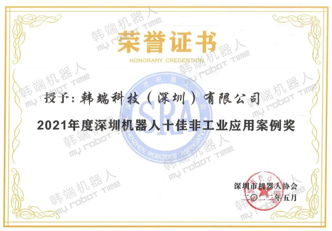 2021深圳機器人年度評選頒獎典禮舉辦,韓端科技榮獲“十佳非工業應用案例獎”!