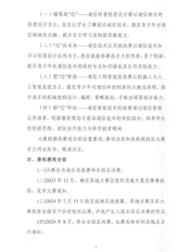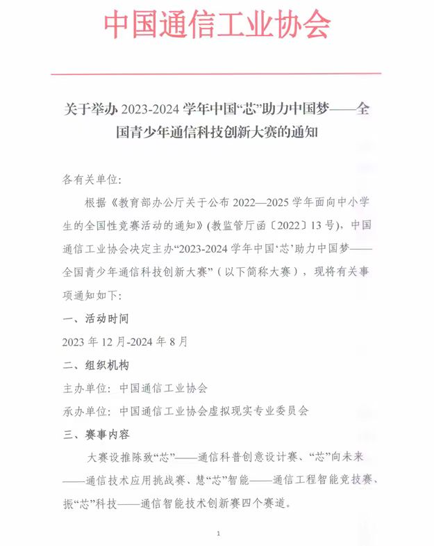 中國(guó)“芯”助力中國(guó)夢(mèng)——全國(guó)青少年通信科技創(chuàng)新大賽由中國(guó)通信工業(yè)協(xié)會(huì)主辦,旨在貫徹落實(shí)黨的二十大報(bào)告和習(xí)近平總書記關(guān)于加強(qiáng)基礎(chǔ)研究和科學(xué)教育的重要指示精神,響應(yīng)教育部等十八部門聯(lián)合印發(fā)的《關(guān)于加強(qiáng)新時(shí)代中小學(xué)科學(xué)教育工作的意見》,推動(dòng)中小學(xué)生科學(xué)素養(yǎng)和創(chuàng)新能力的提升,培養(yǎng)具有科學(xué)家潛質(zhì)和愛國(guó)情懷的優(yōu)秀人才。