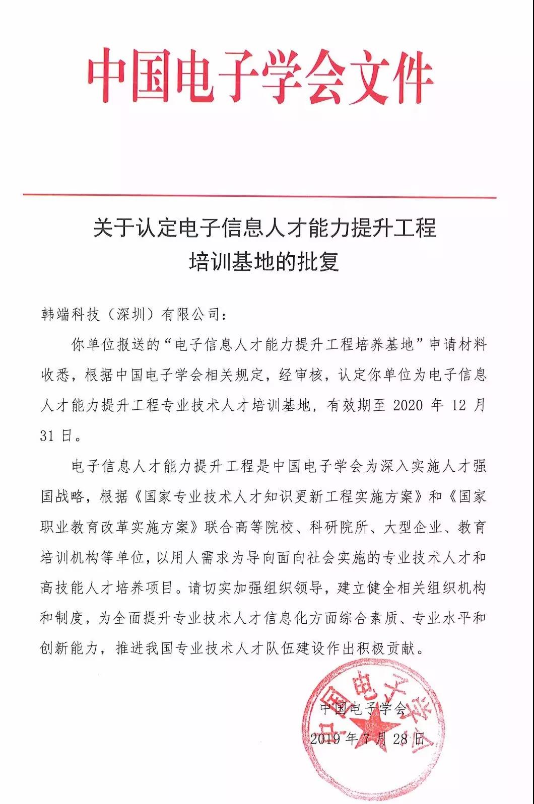 經過韓端團隊長時間的努力得到中國電子學會的高度認可,授予韓端機器人器材為全國青少年機器人技術等級考試的推薦評審器材,給在韓端客戶進行機器人與編程學習的孩子和社會上從事機器人與編程研究的相關人員提供一個權威的檢驗平臺。