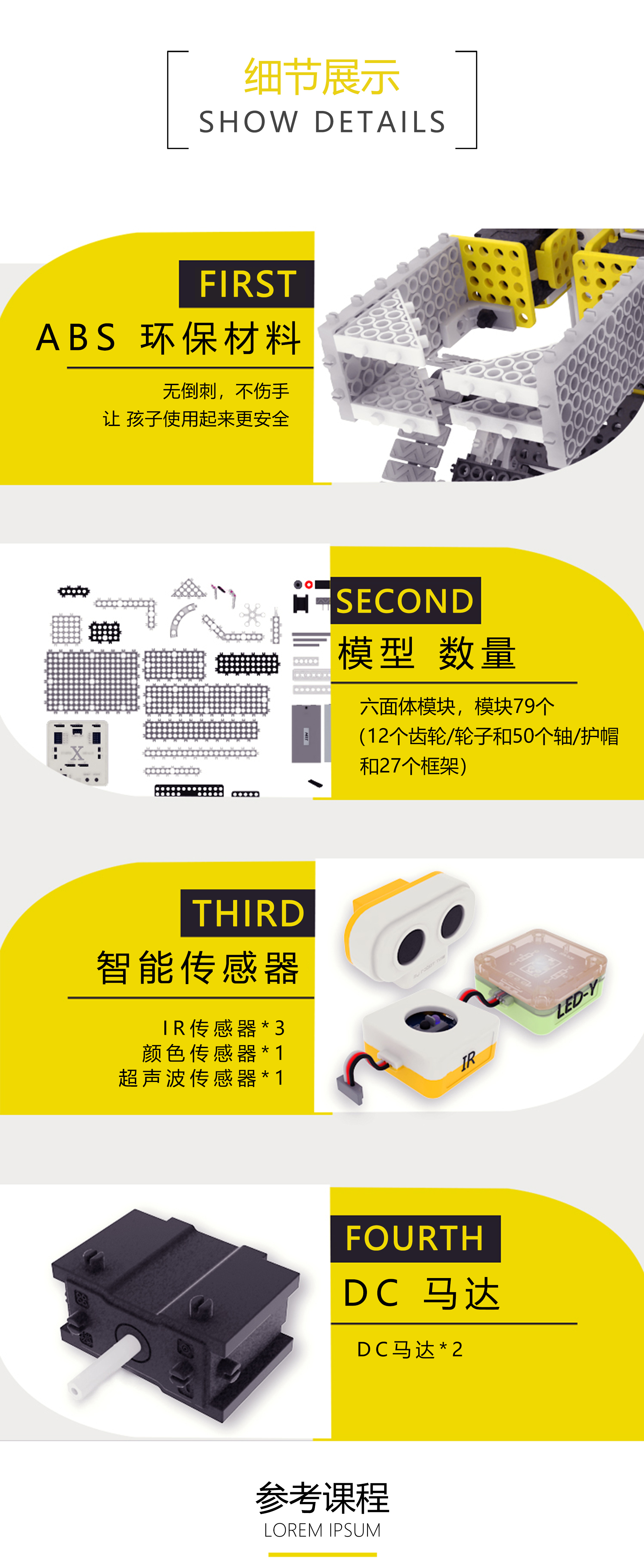 產品名稱:MRTX-1 外觀顏色:多彩積木 產品材料:ABS環保材料 模塊特性:六面體模塊 ,小顆粒 電 機:DC馬達 主 板:編程主板 模型數量:10個 額定電壓:9V 功 能:DIY 教學,動靜結合,形象生動。主板為開關控制模式,一鍵式按鈕設計讓機器人操作顯得簡潔而簡單。適合幼兒初學階段。 適用年齡:7-9歲 重 量:2KG 配 置:原始教材,超聲波傳感器,顏色傳感器,IR傳感器 包裝尺寸:寬250*厚350*高90mm